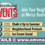 Mark your calendar for the Neighborhood Summer Social events are that are being planned right now by the new social committee Old MTV Eventors. Chalk it Up to Summer!NEIGHBORHOOD CHALK PARTY — Grab some chalk, use your imagination & have … Continue reading